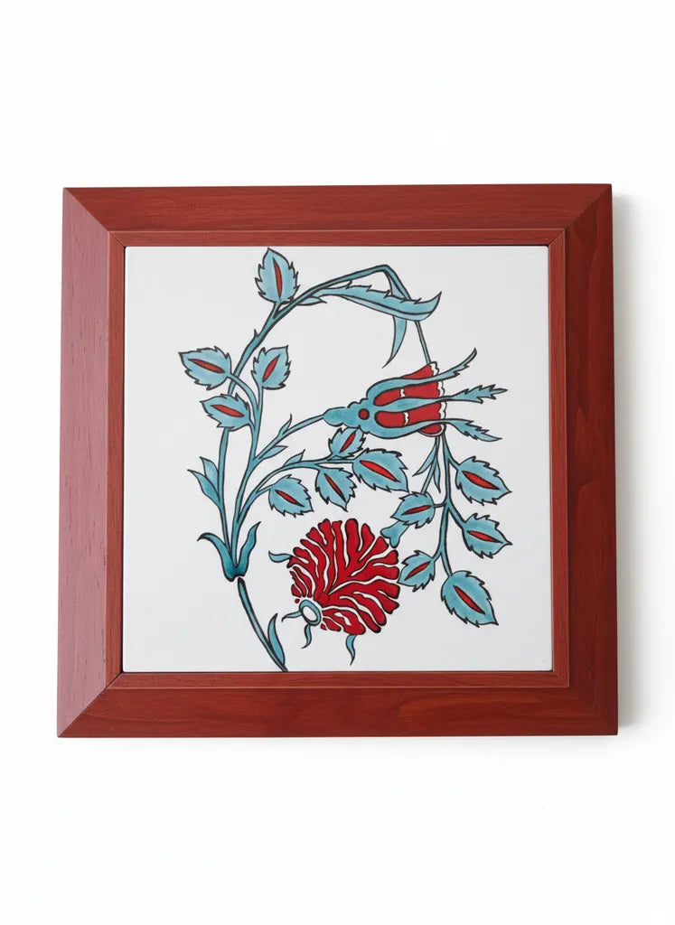 Ahşap Çerçeveli Goncagül Desenli El Yapımı Çini Tablo (27x27 cm)