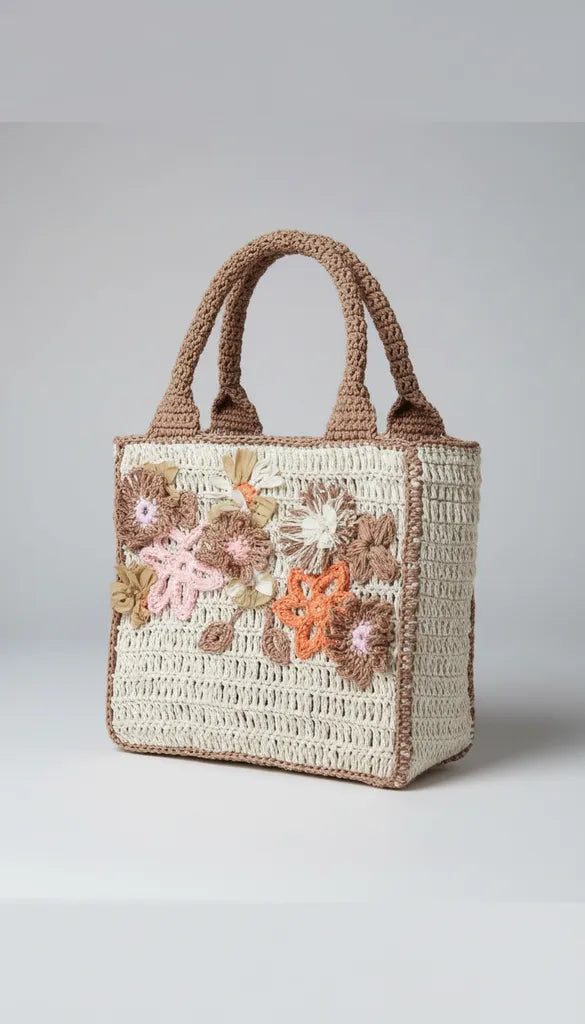 Bej Kağıt İpten Örme Çiçek Detaylı Kutu Çanta El Emeği