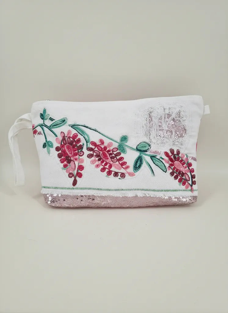 Beyaz Kanvas Kumaş Nakışlı Portföy Çanta Özel Tasarım El İşlemesi