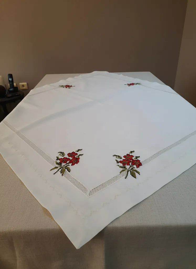 Beyaz Pamuklu Kumaş Üzerine Kırmızı Çiçek Desenli Kanaviçe Takımı