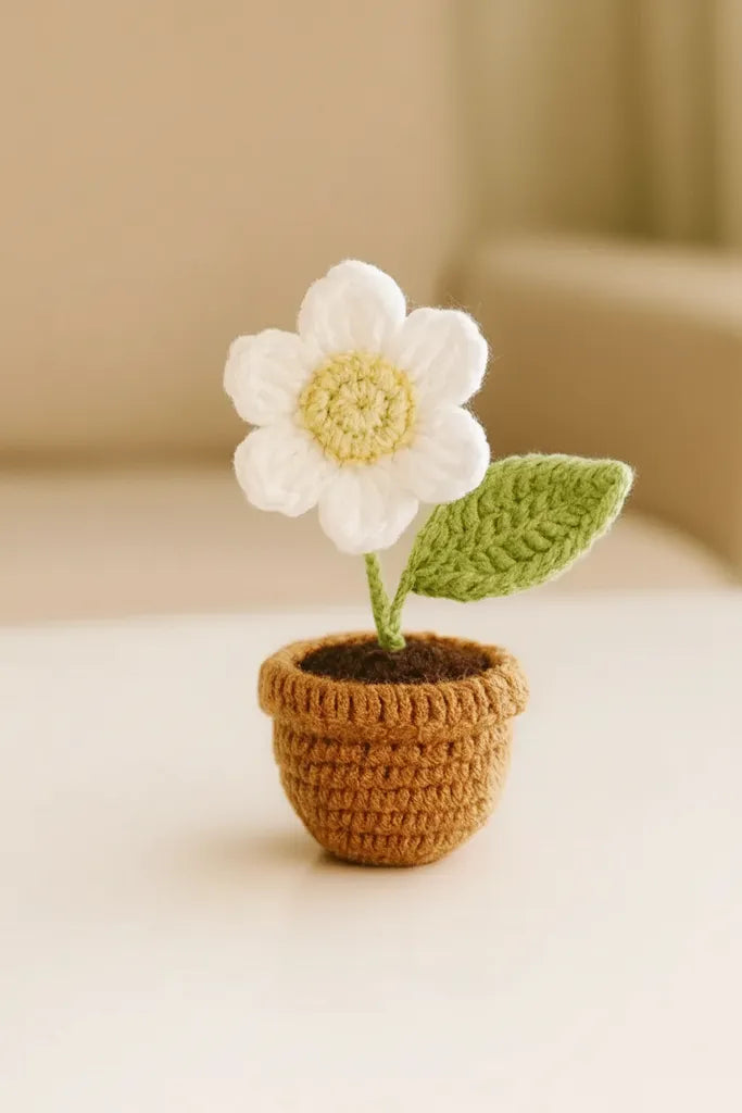 Beyaz Papatya Motifli Amigurumi Saksı Bitki Dekorasyon
