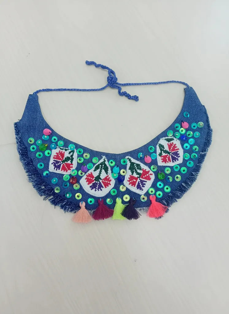Denim Kumaş Üzeri İşlemeli Otantik Kolye El Yapımı Tasarım