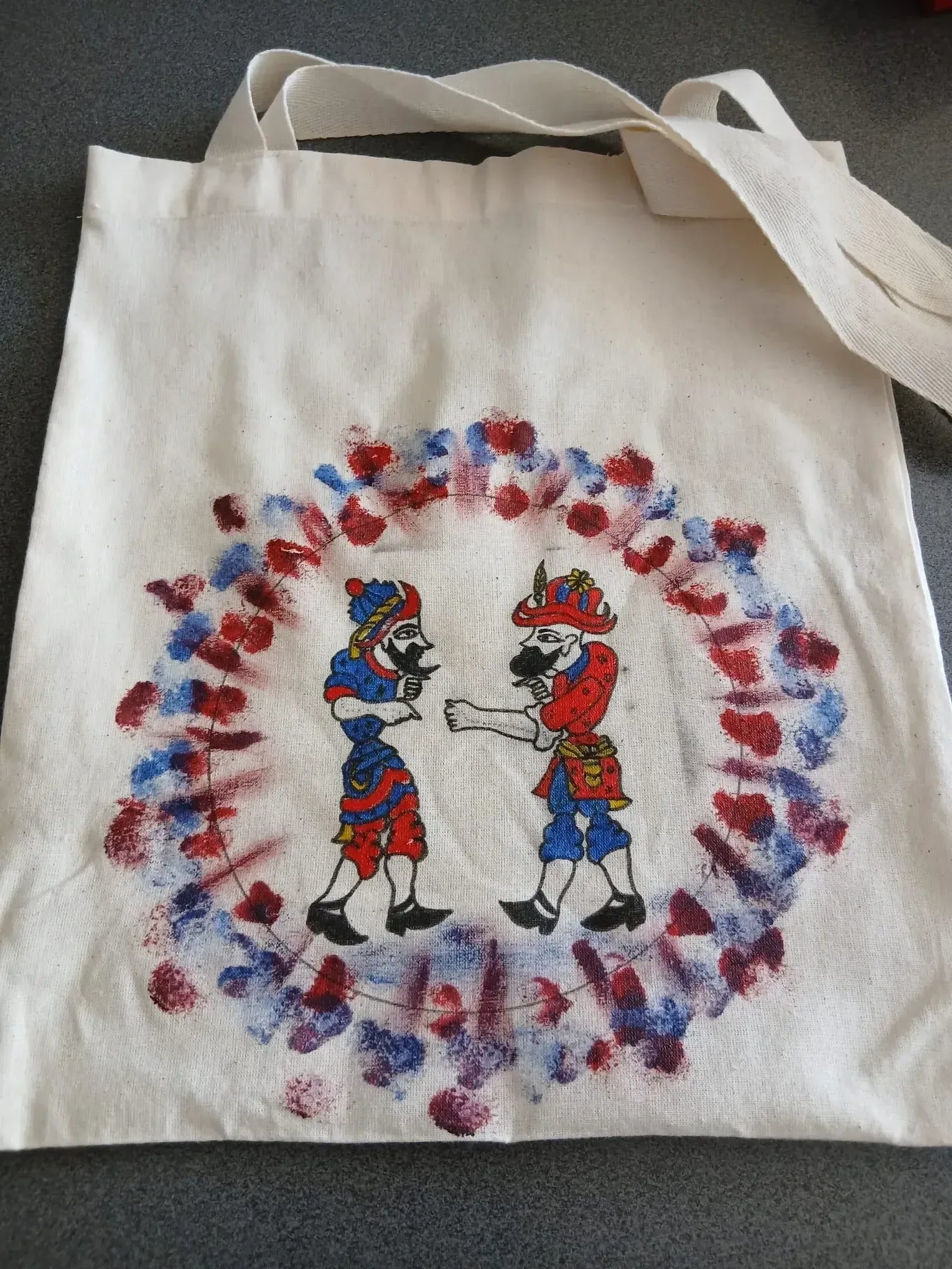 El Boyaması Bez Çanta Hacivat ve Karagöz Desenli Akrilik Tasarım