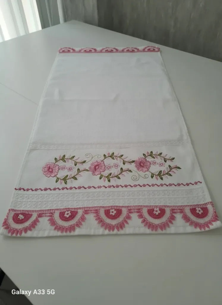 El İşi Pembe Çiçek Motifli İğne Oyası Beyaz Havlu Kenar Dantelli