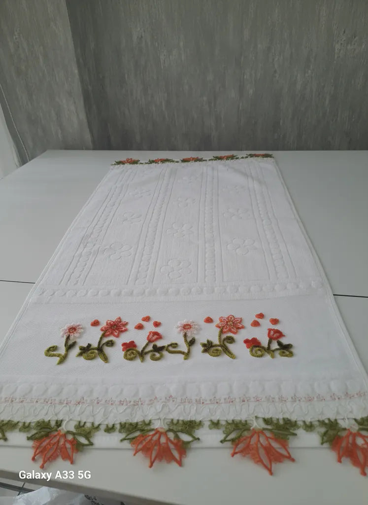 El İşlemesi Mekik Oyası Detaylı Beyaz Pamuklu Osmanlı Havlu Kenarı, banyonuza otantik bir hava katarken, el emeği göz nuru detaylarıyla da dikkat çekiyor. Yumuşak dokusu ve zarif tasarımıyla hem günlük kullanım hem de özel günler için ideal bir seçimdir. Osmanlı motiflerinin modern bir yorumu olan bu havlu kenarı, geleneksel el sanatlarımızın zarafetini evinize taşıyor. Banyonuzda şık bir detay olarak kullanabileceğiniz gibi, sevdiklerinize özel bir hediye alternatifi de olabilir. Pamuklu dokusu sayesinde suyu hızlı emer ve kolayca kurur. Uzun ömürlü kullanım için kaliteli malzemelerden üretilmiştir. Ürün Özellikleri: Malzeme: %100 Pamuk Renk: Beyaz Detay: El İşlemesi Mekik Oyası (Turuncu, Yeşil ve Beyaz tonlarında çiçek desenleri) Stil: Osmanlı / Geleneksel Kullanım Alanı: Banyo, Mutfak, El Yüz Havlusu Kenarı Özellik: Yüksek Su Emiciliği, Hızlı Kuruma Bakım: Makinede yıkanabilir, düşük ısıda ütülenebilir.