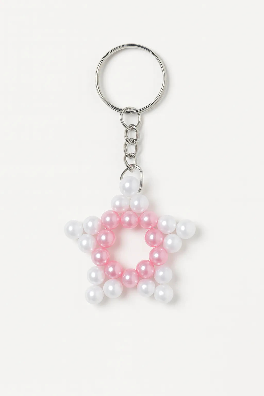 Ürün Özellikleri:Renk: Pembe ve beyazMalzeme: Parlak akrilik boncuk ve metal halkaForm: Yıldız şekliEbat: Yaklaşık 6 x 6 cmÜretim Tekniği: El işçiliğiyle boncuk dizimiKullanım Alanı: Anahtarlık, çanta süsü veya hediye aksesuarı olarak uygundurÜretim: El yapımı, özel tasarım