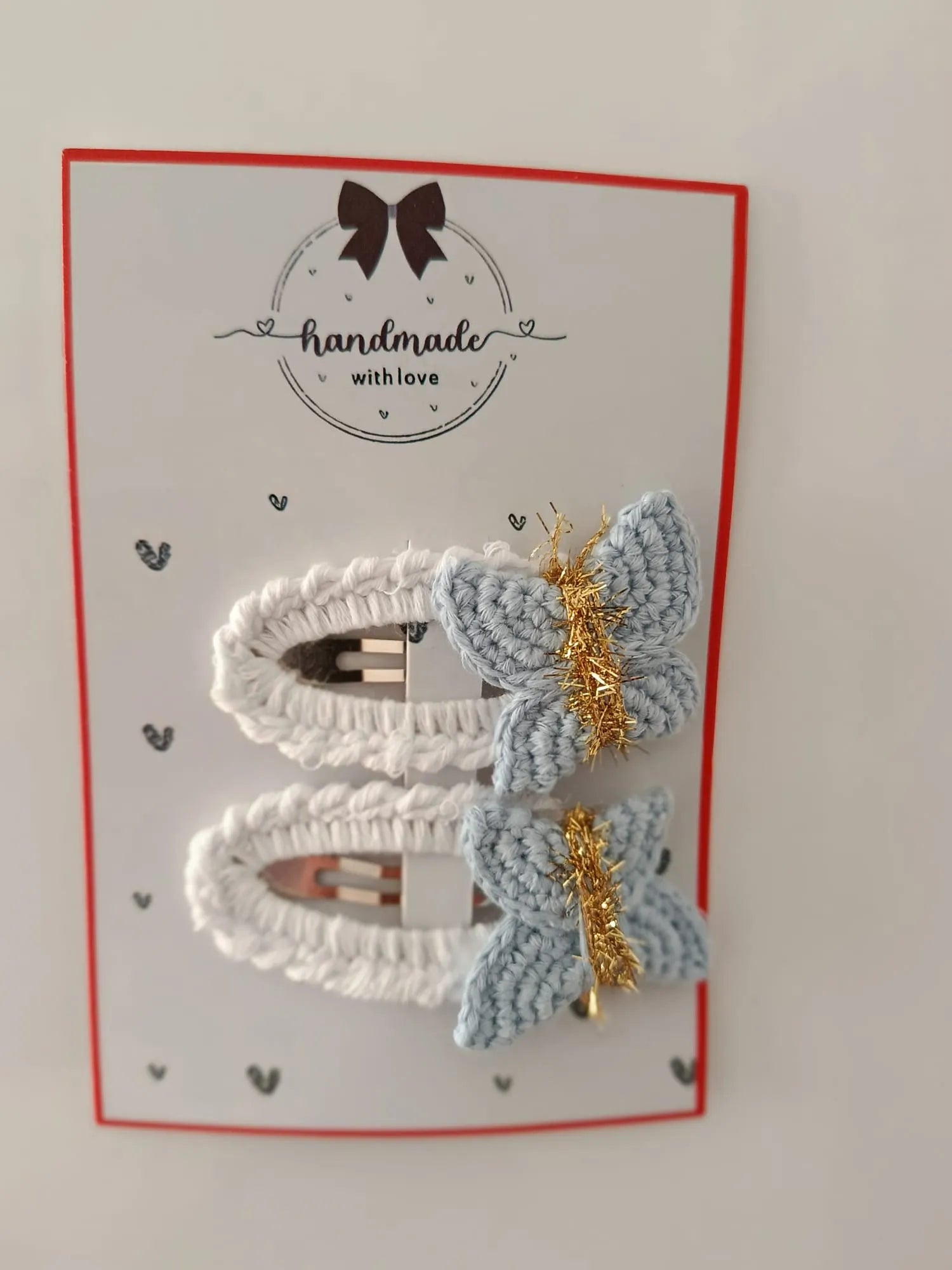 El emeğiyle örülmüş kelebek figürlü tokalar, saçlara masalsı bir şıklık katar. Açık mavi kanatlar ve altın sarısı parlak detaylar, beyaz örgü kaplamalı tokayla birleşerek zarif bir görünüm sunar. Günlük kullanımda sade bir şıklık, özel günlerde ise göz alıcı bir tamamlayıcı olarak öne çıkar.Tokaların metal klipsleri örgü ip ile kaplanmış, üzerine işlenen kelebek motifleri ince el işçiliğiyle hazırlanmıştır. Hem çocukların hem de yetişkinlerin severek kullanabileceği bu model, farklı ve sevimli bir hediye alternatifi de olabilir.Ürün Özellikleri:El yapımıdır.Açık mavi kelebek motifli tasarıma sahiptir.Kelebek gövdesinde altın sarısı ışıltılı ip kullanılmıştır.Zemin kısmı beyaz örgü ip ile kaplanmıştır.Sağlam metal klips uzun ömürlü kullanım sağlar.Çocuk ve yetişkin kullanımına uygundur.İkili set halinde gönderilmektedir.