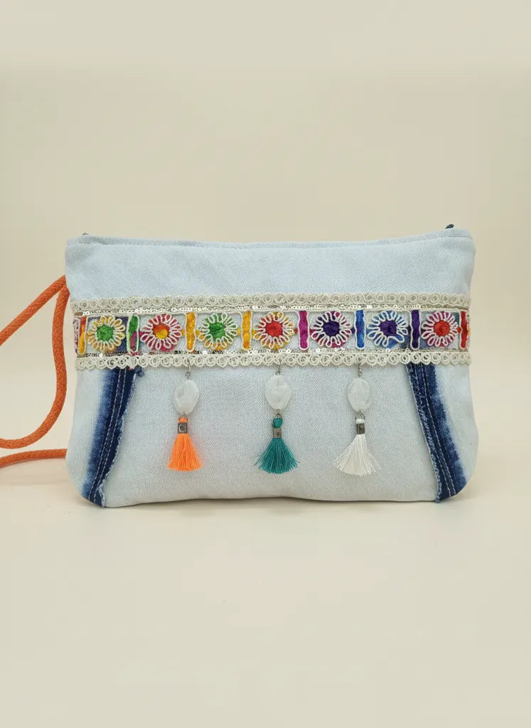 El Yapımı Kot Portföy Çanta Renkli Nakış Detaylı ve Püsküllü Şık Clutch