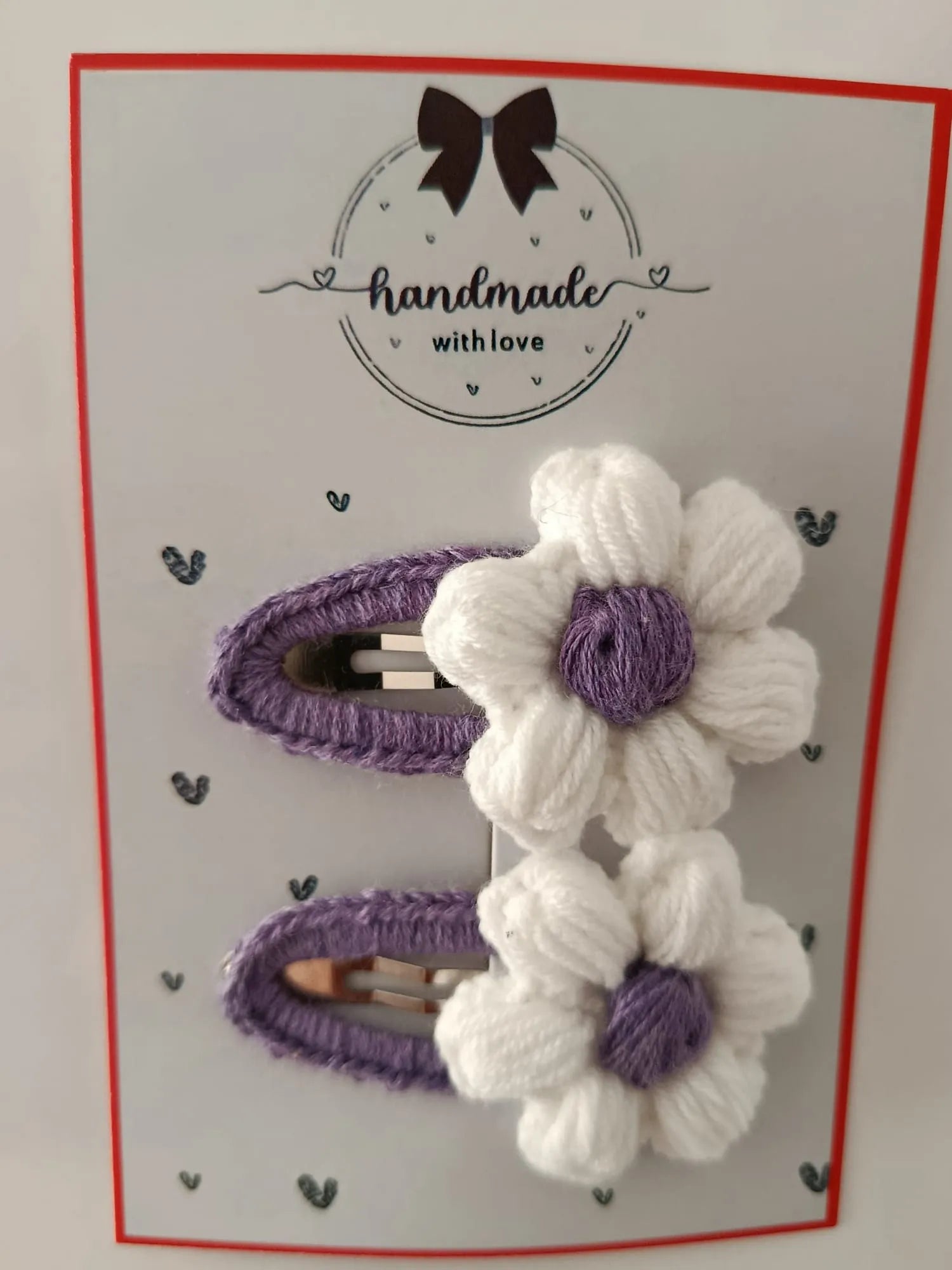 El emeğiyle hazırlanan mor papatya tokalar, zarif ve modern görünümüyle saçlara farklı bir hava katar. Beyaz yaprakların ortasında kullanılan mor detay, sadelik ve şıklığı bir araya getirirken; mor örgü kaplama tokaya bütünlük kazandırır. Hem günlük kullanımda hem de özel günlerde tercih edilebilecek hoş bir aksesuardır.Tokaların sağlam metal klipsi mor örgü ip ile kaplanarak estetik bir görünüm elde edilmiştir. Hem çocuklar hem yetişkinler için uygun olan bu el yapımı tokalar, şık ve sevimli tasarımıyla hediye alternatifi olarak da öne çıkar.Ürün Özellikleri:El yapımıdır.Beyaz yapraklı, mor ortalı papatya motiflidir.Zemin kısmı mor örgü ip ile kaplanmıştır.Metal klips sağlam ve uzun ömürlüdür.Çocuk ve yetişkin kullanımına uygundur.İkili set halinde gönderilmektedir.