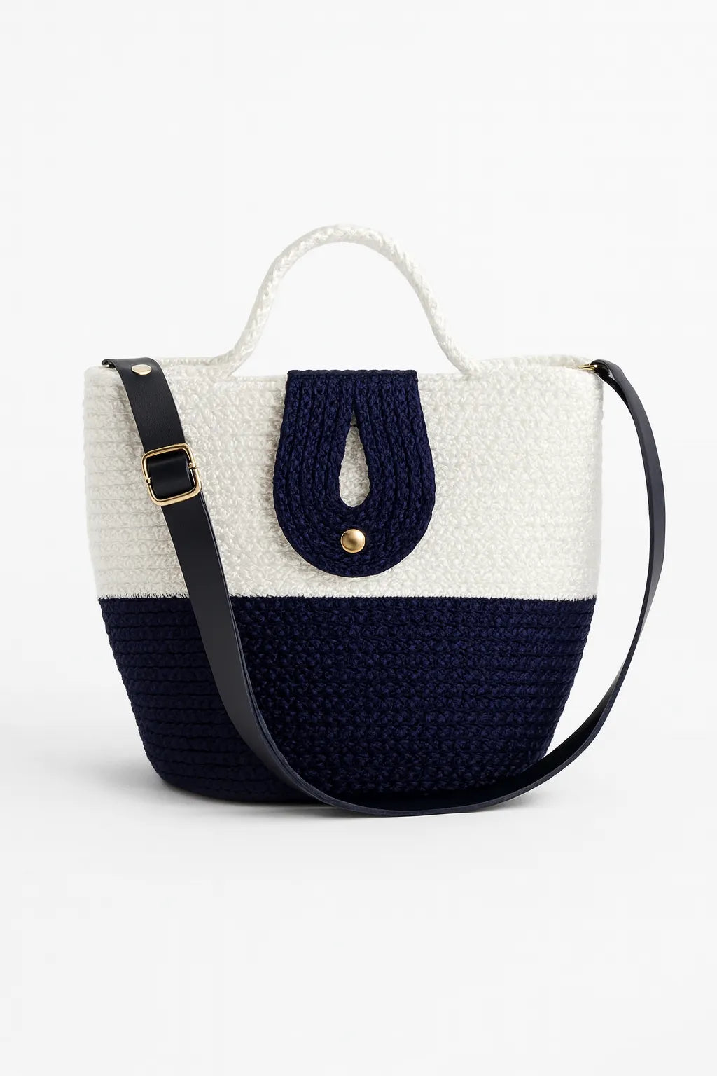 Zarif ve sade şıklığı bir araya getiren bu el yapımı lacivert-beyaz örgü omuz çantası, günlük kombinlerinizin vazgeçilmezi olacak. Örgü dokusuyla doğal ve sıcak bir görünüm sunarken, kaliteli suni deri omuz askısı sayesinde şıklığı ve işlevselliği bir arada sunar.Çift renkli tasarımı, alt kısımda lacivert ve üstte beyaz olmak üzere iki tonlu harmonik bir kontrast yaratır. Orta boy yapısıyla hem günlük eşya taşıma ihtiyacına cevap verir hem de tarzınıza özgünlük katar. Gold düğmeli kapak detayı ise çantaya modern bir dokunuş katar.Ürün Özellikleri:Renk: Lacivert (alt) + beyaz (üst)Malzeme: Kaliteli örme ip ve suni deri omuz askısıAskı: Ayarlanabilir omuz askısı + kısa el sapıKapak: Gold düğmeli örgü detaylı kapamaBoyut: Orta boy (günlük kullanım için ideal)Kullanım: Omuzda veya elde taşımaya uygunKullanım Alanları:Günlük şehir hayatıOfis – okul – alışveriş kombinleriModern ve sade el emeği hediye alternatifi