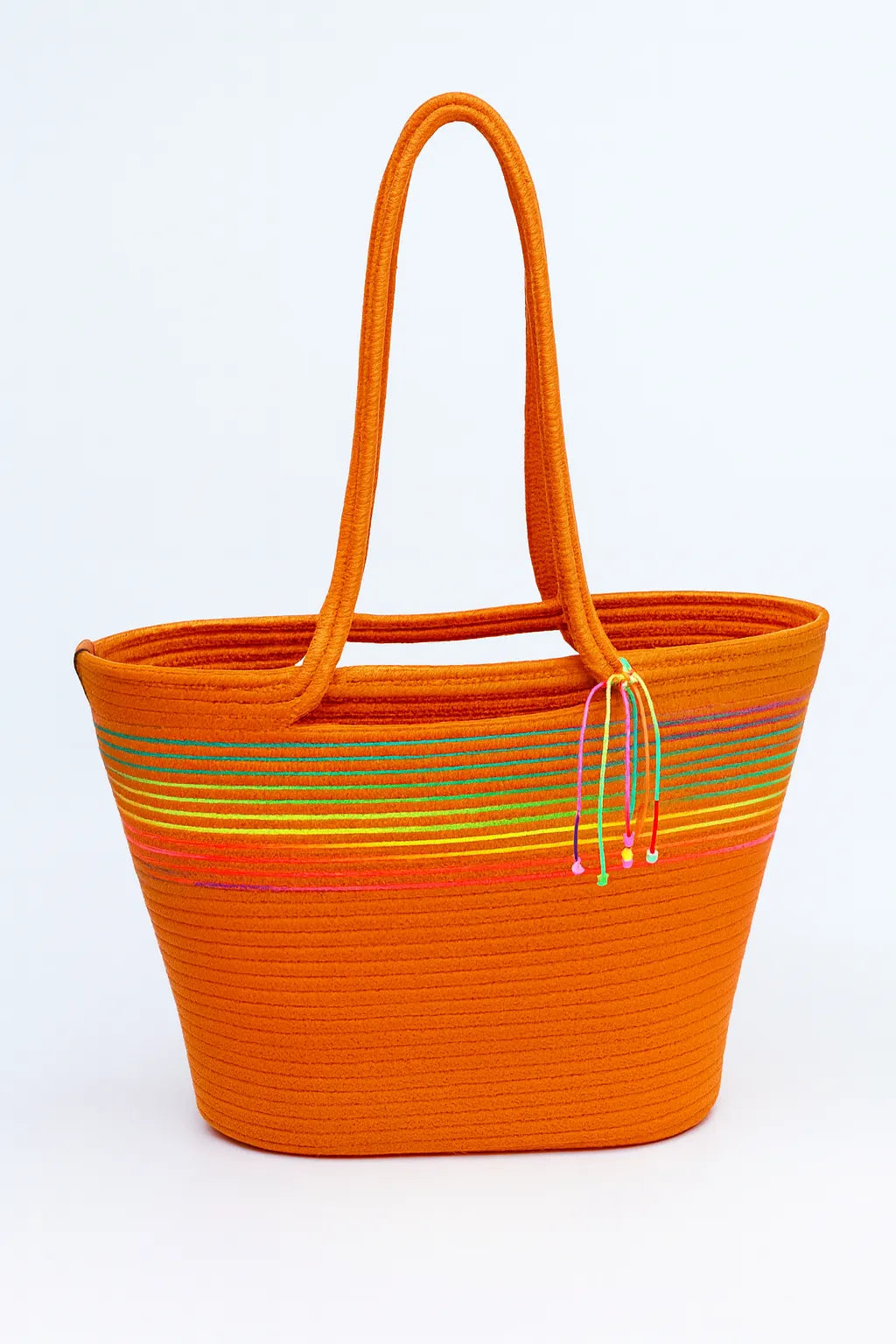 Yazın enerjisini taşıyan bu el yapımı örme plaj çantası, hem şık hem de işlevsel bir tasarıma sahiptir. Canlı turuncu zemin üzerine renkli şerit detaylarıyla hareket kazandırılmış çanta, plajda, alışverişte veya şehir içinde stilinizi tamamlayan özgün bir aksesuar sunar.Geniş iç hacmi sayesinde havlu, kitap, güneş kremi gibi tüm ihtiyaçlarınızı rahatça taşıyabilirsiniz. Kalın ve yumuşak sapları taşıma sırasında konfor sağlar. Renkli ip süslemeleriyle tamamlanan tasarımı modern ve neşeli bir görünüm sunar.Ürün Özellikleri:Renk: Turuncu gövde + çok renkli şerit detaylarıMalzeme: Kaliteli örme ipModel: Saplı, omuzda taşımaya uygunHacim: Geniş iç hacimliKullanım: Plaj çantası, alışveriş çantası, yazlık günlük çantaAksesuar: Renkli ip püskül detayıNerelerde Kullanılır?Tatil valizinizin vazgeçilmezi olarak plajdaGünlük alışverişlerde çevre dostu alternatif olarakYazlık kombinlerinize renk katacak tamamlayıcı olarak