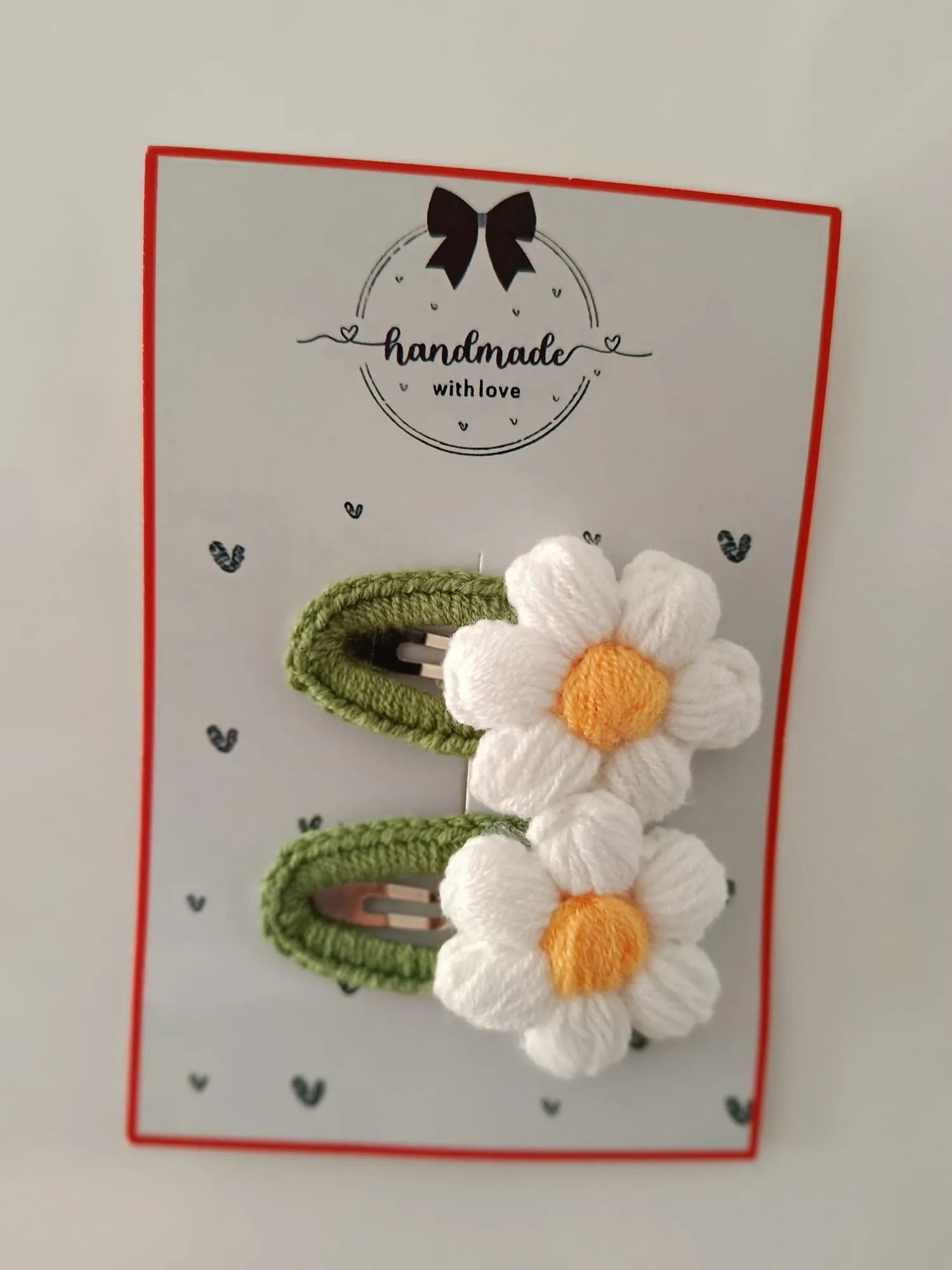 El emeğiyle hazırlanan papatya tokalar, saçlara doğal ve canlı bir görünüm kazandırır. Beyaz yaprakları ve sarı ortasıyla güneşin sıcaklığını yansıtırken, yeşil örgü kaplaması doğallığı ön plana çıkarır. Hem günlük kullanımda hem de özel günlerde sevimli bir tamamlayıcıdır.Saçları güvenle tutan metal klipsler, ip ile tamamen sarılarak şık bir görünüme kavuşturulmuştur. Çocuklar için olduğu kadar yetişkinlerin de rahatlıkla tercih edebileceği bu tokalar, doğadan ilham alan tasarımıyla hediye etmek için de uygundur.Ürün Özellikleri:El yapımıdır.Beyaz yapraklı, sarı ortalı papatya motiflidir.Zemin kısmı yeşil örgü ip ile kaplanmıştır.Metal klips sağlam ve uzun ömürlüdür.Çocuk ve yetişkin kullanımına uygundur.İkili set halinde gönderilmektedir.