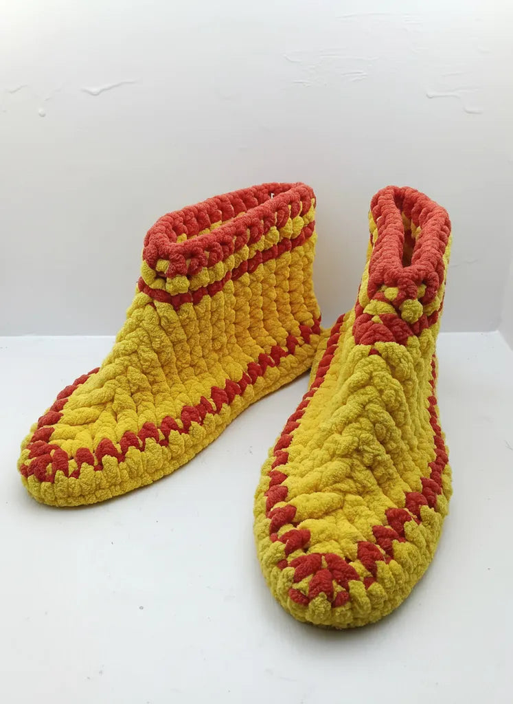 Kadın Sarı Kırmızı Renkli Ev Botu El Örmesi Sıcak Tutucu 3738
