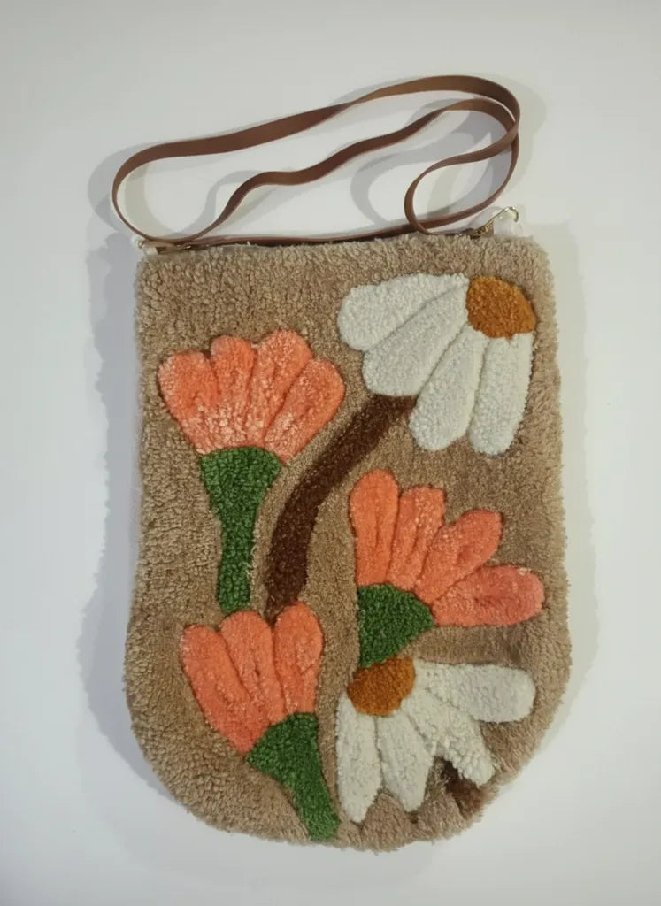 Kahverengi Halı Dokuma Çanta Turuncu ve Beyaz Çiçek Desenli El Yapımı