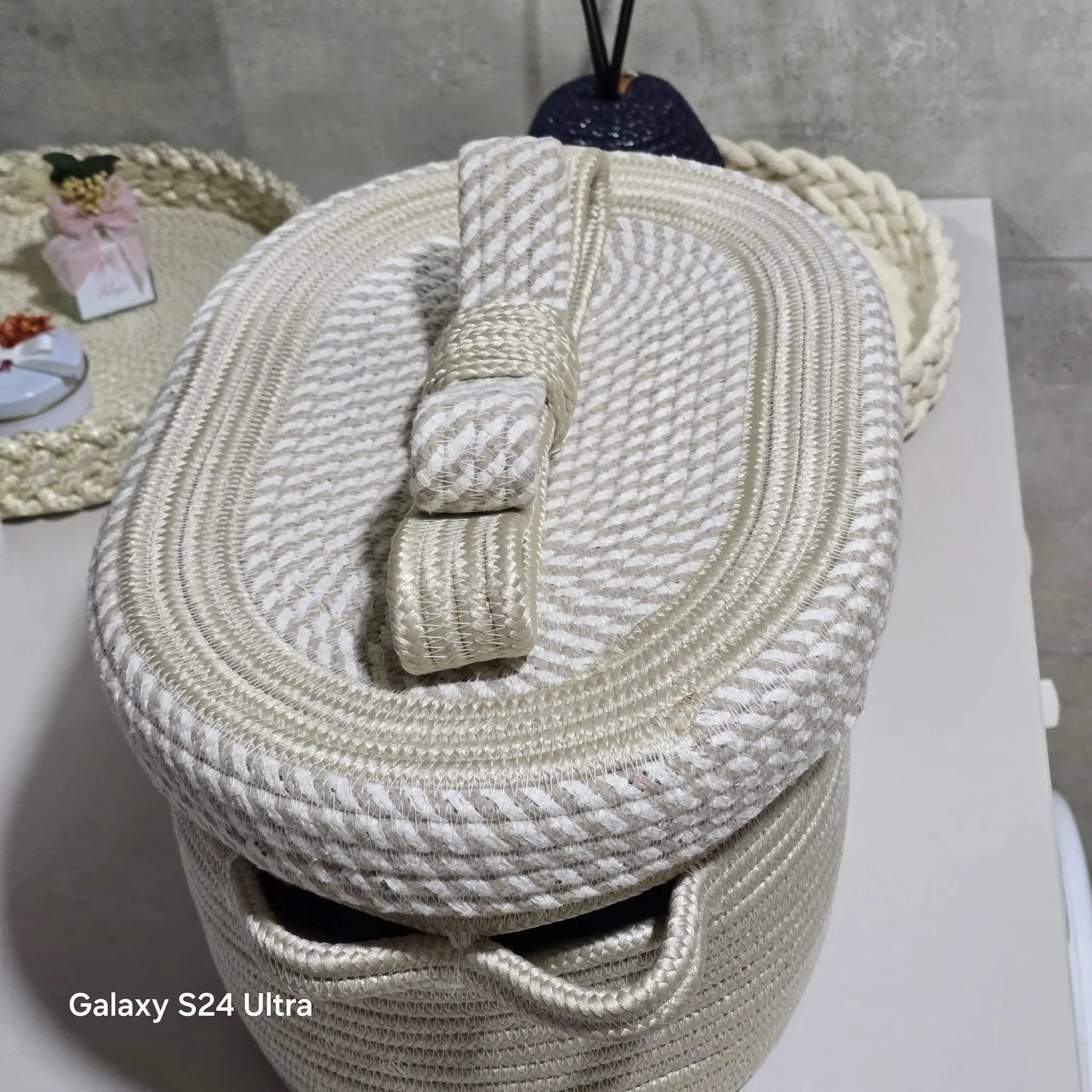 Ürün Özellikleri:Renk: Vizon / KremForm: OvalMalzeme: Kalın örgü ipKapanış Tipi: KapaklıEbatlar: 36 x 25 x 20 cmAğırlık: 1155 grKullanım Alanı: Kıyafet, oyuncak, aksesuar veya ev eşyası düzenlemede çok amaçlı kullanım için uygundur.