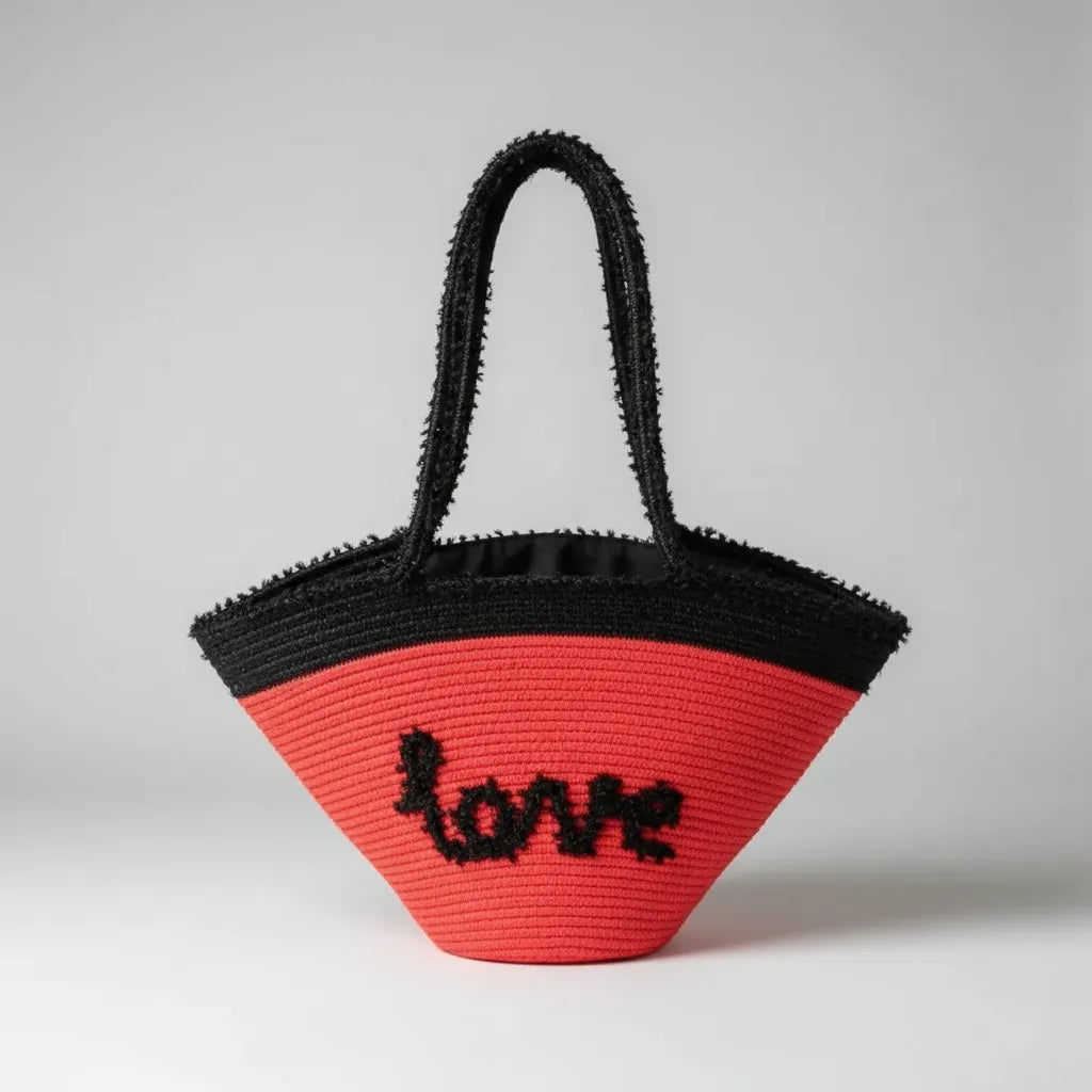 Kırmızı ve Siyah Hasır Plaj Çantası Love Yazılı El Yapımı