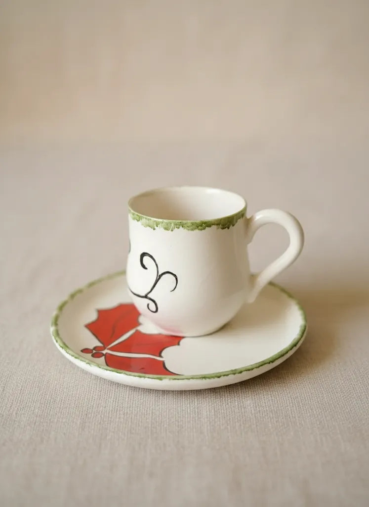 Kokinalı Desenli Seramik Kahve Fincanı ve Tabağı Seti Çini El Sanatı
