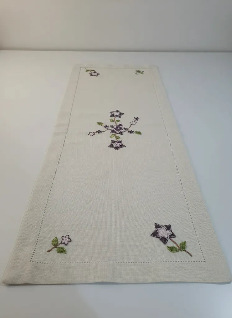 Krem Rengi Mor Çiçek Desenli İğne Oyası Detaylı Runner 40x105 cm