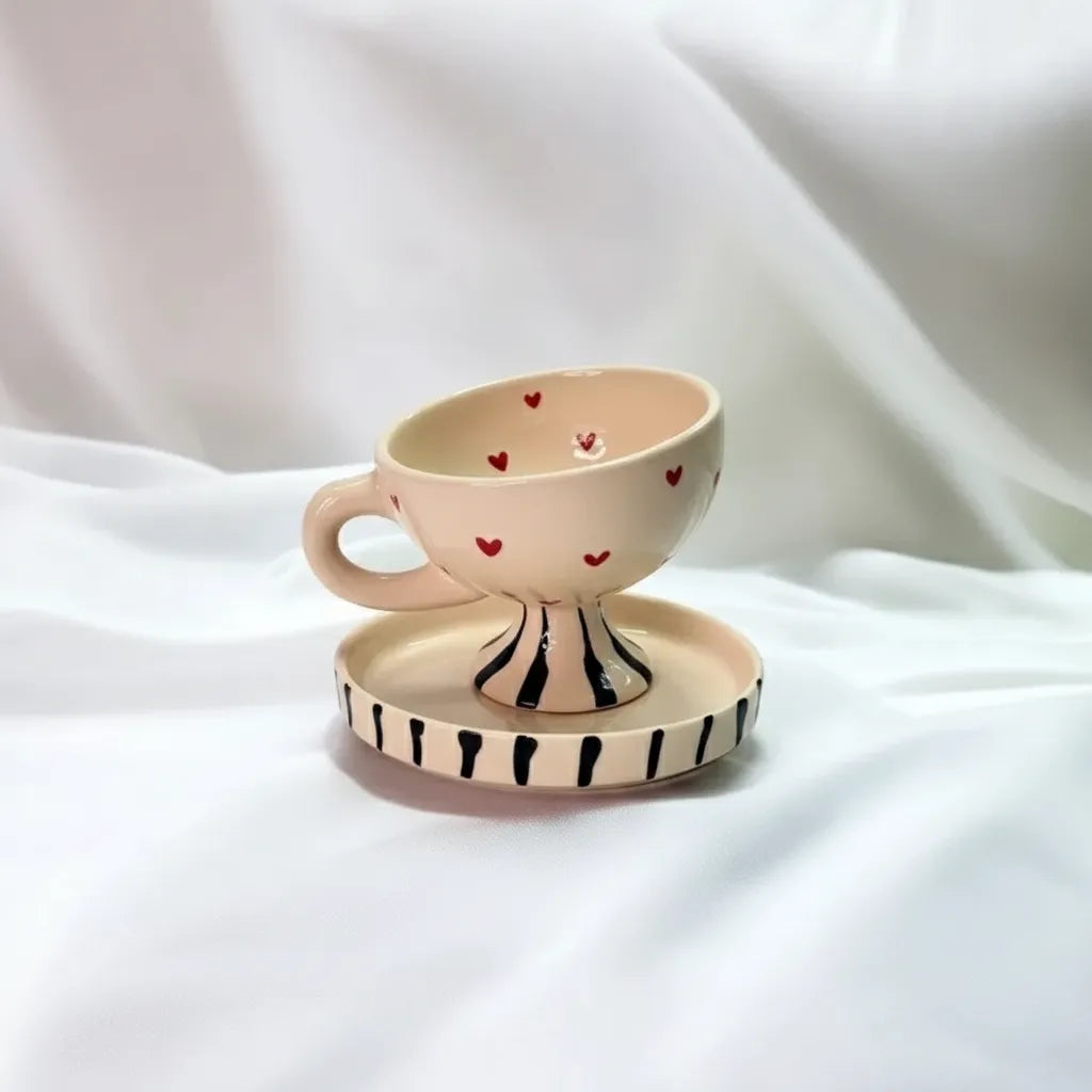 Krem Renkli Kalp Desenli 2'li Fincan Seti El İşçiliği