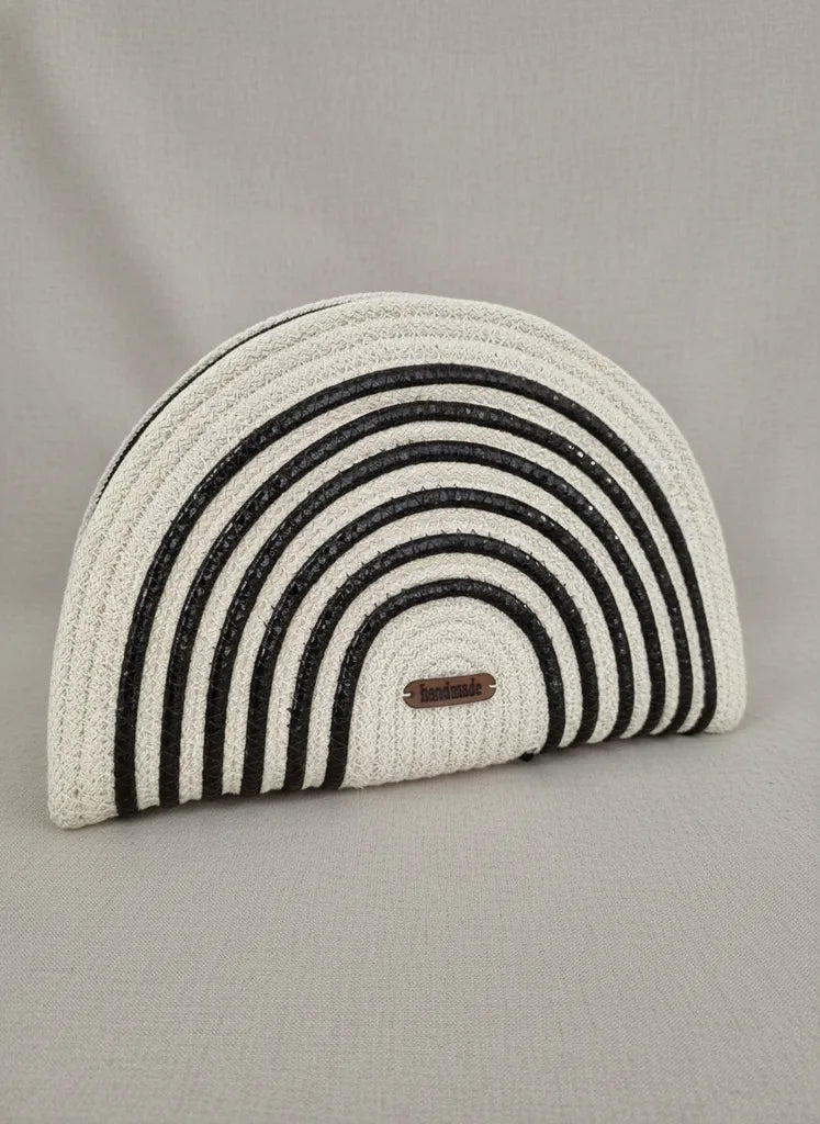 Krem Renkli Siyah Şeritli Hasır Görünümlü Kadın El Çantası El Yapımı