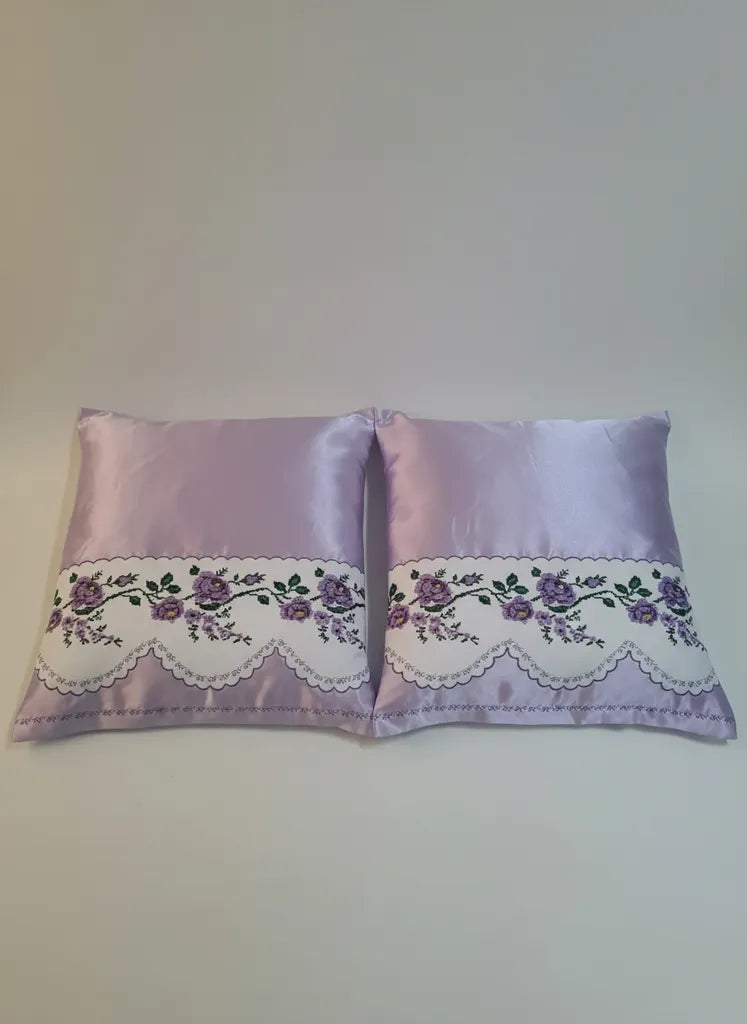 Lila Pamuk Saten Kanaviçe İşlemeli Dekoratif Yastık Kılıfı Takımı