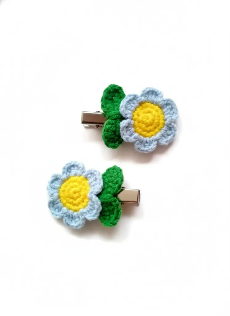 Mavi Papatya Motifli Örgü Bebek Saç Tokası Kıskaçlı El Emeği