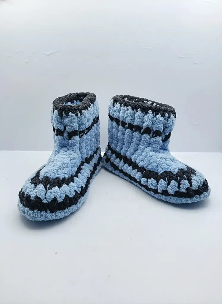 Mavi Siyah Çizgili Çocuk Ev Patiği El Örmesi 3031 Numara