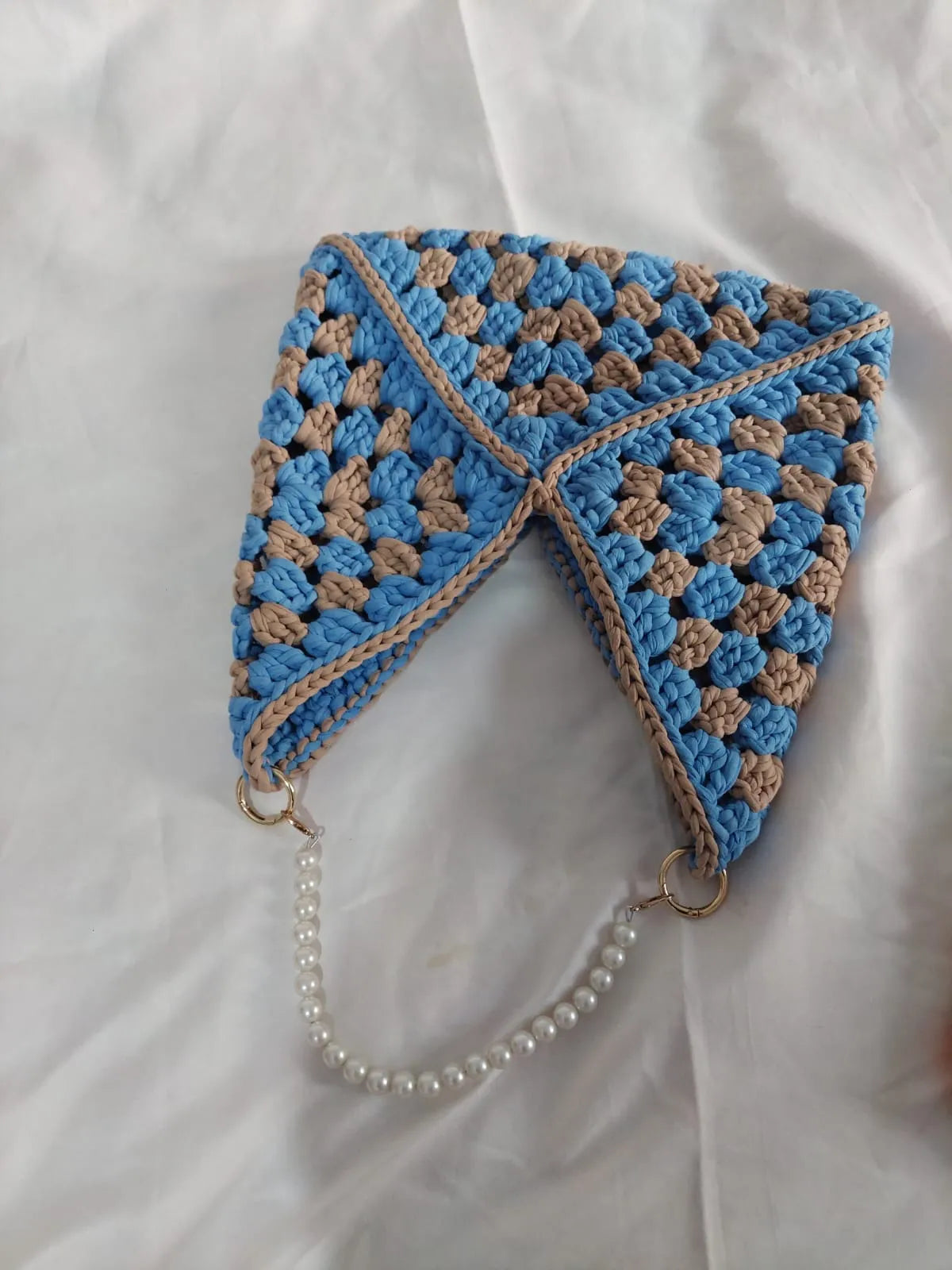 Mavi ve Bej Renkli Kare Motifli Örgü Çanta Boncuklu Askılı El Emeği