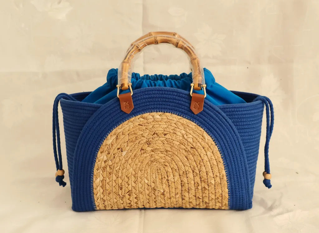 Mavi ve Hasır Detaylı Örgü Kol Çantası El Yapımı Özel Tasarım