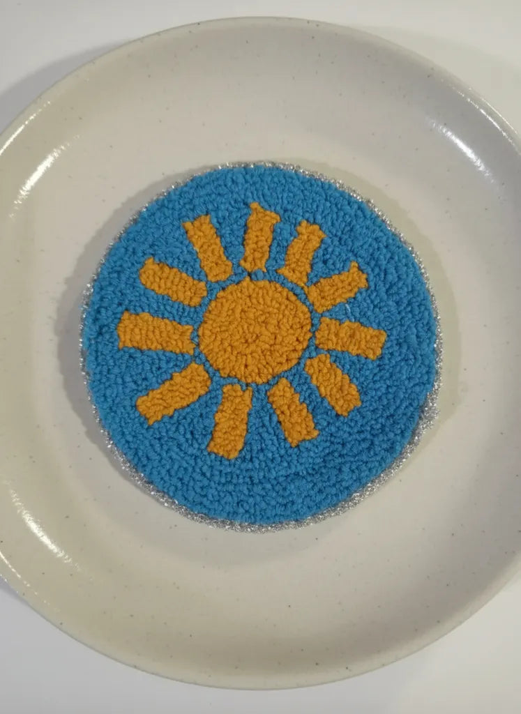 Mavi ve Sarı Güneş Desenli Bardak Altlığı El Yapımı Punch Nakışı