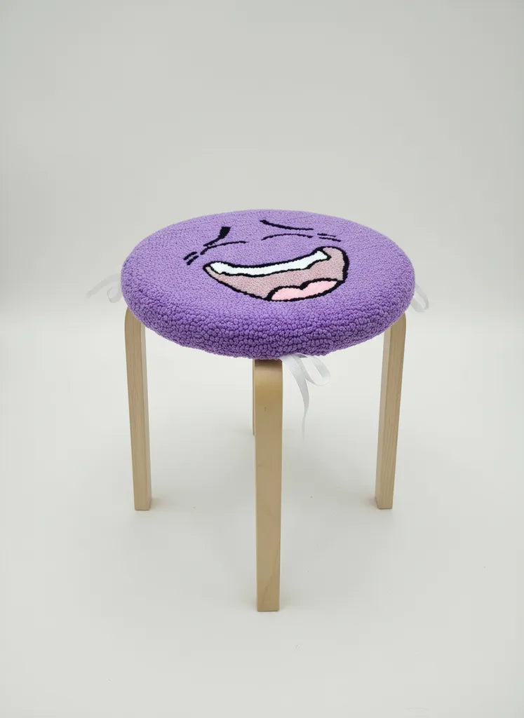 Mor Gülen Yüz Desenli El Yapımı Yuvarlak Tabure Kılıfı 38 cm