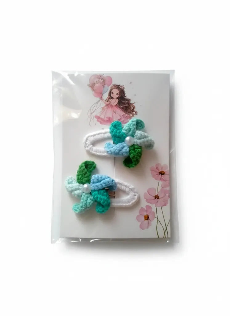 Örgü Mavi ve Yeşil Çiçek Motifli Kız Çocuk Toka Seti El Emeği
