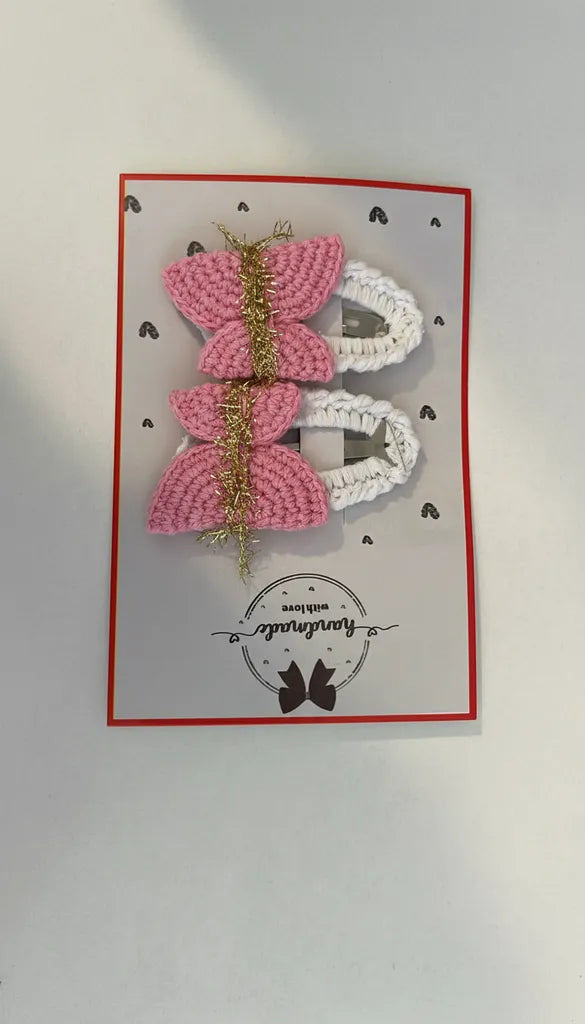 Pembe Örgü Kelebek Figürlü Saç Tokası Seti El Emeği