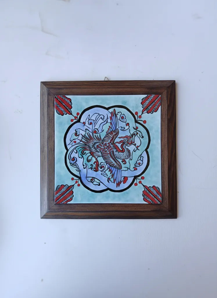 Phoenix Desenli El Yapımı Çini Tablo Sarıçam Ahşap Çerçeveli 27x27 cm