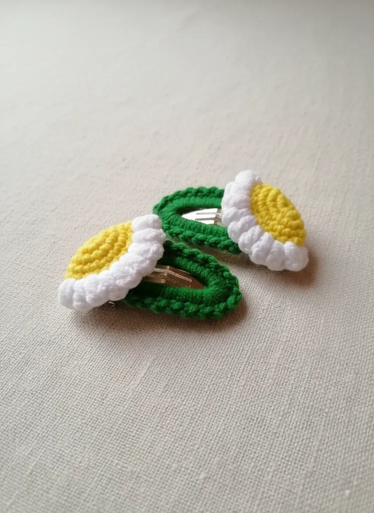 Sarı Beyaz Papatya Motifli Örgü Kıskaçlı Saç Tokası El Emeği