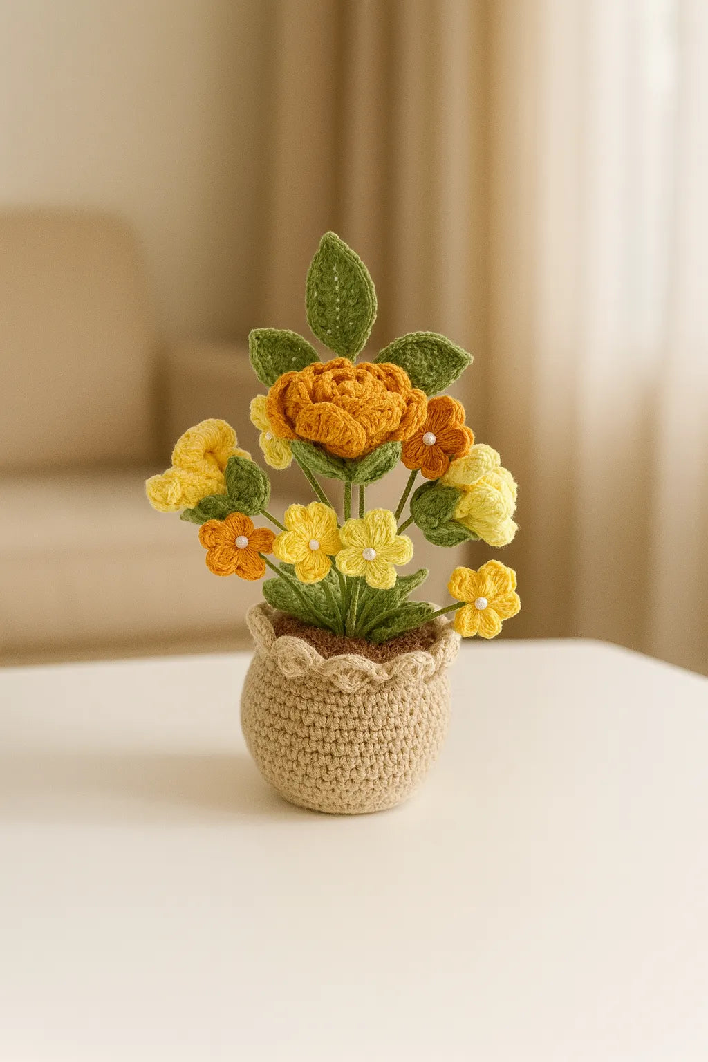 Sarı Tonlarında Örgü Çiçek Aranjmanı ve Saksı El Emeği
