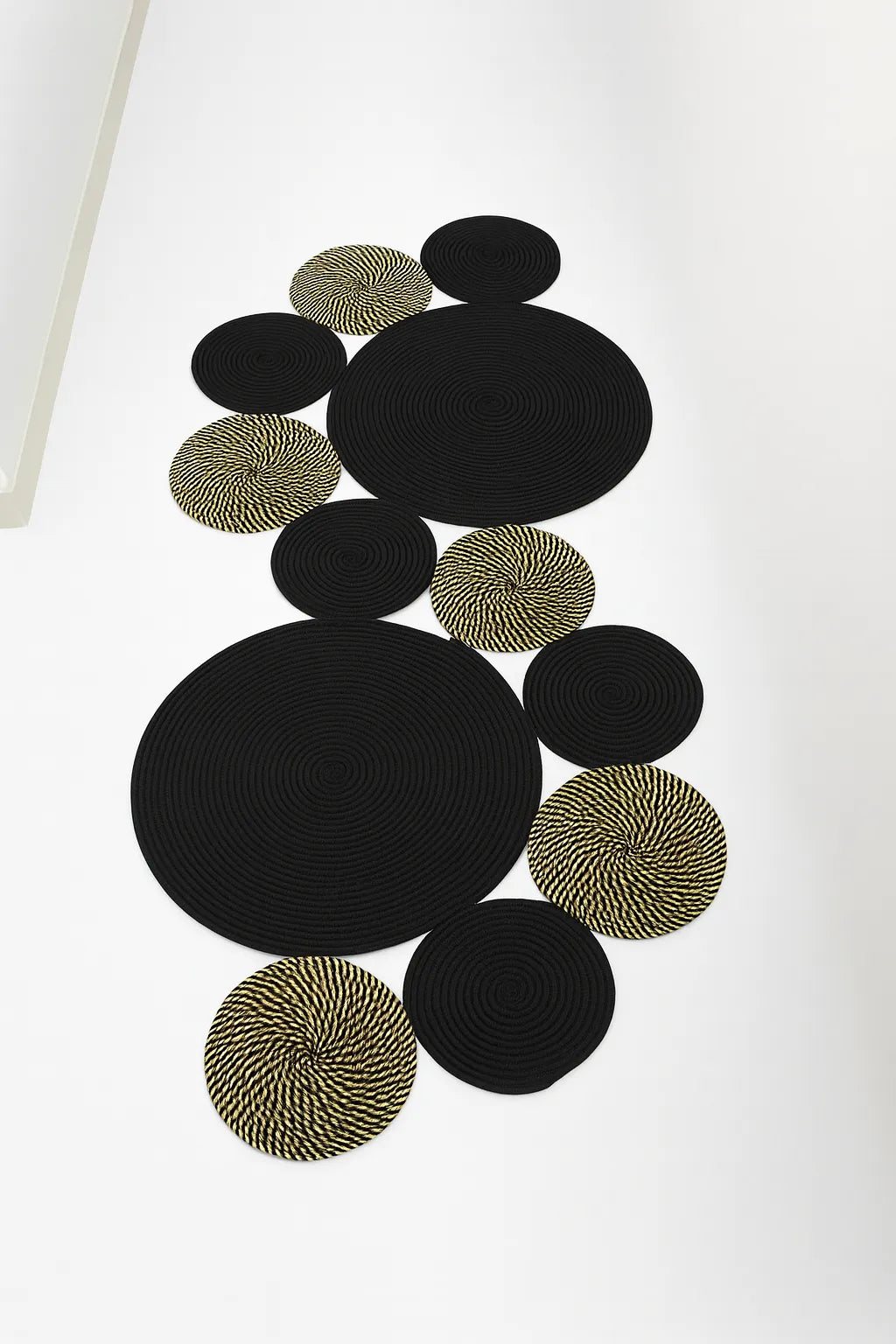 Ürün Özellikleri:Renk: Siyah zemin üzerine gold detaylı iplikMalzeme: Dayanıklı Tressip kumaşDikiş Tekniği: Zikzak dikişle elde dikimEbat: 175 x 75 cmKullanım Alanı: Giriş holü, oturma odası, banyo veya sehpa altı dekoratif paspasTemizlik: Pratik ve kolay temizlenebilir yapıÜretim Yeri: Tressip özel tasarım koleksiyonu