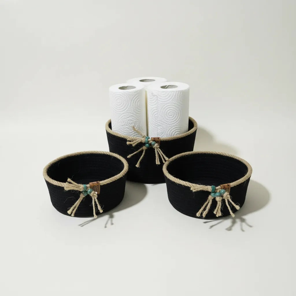 Siyah Halat İp Organizer Sepet Seti 3'lü El Emeği Dekoratif Sepet