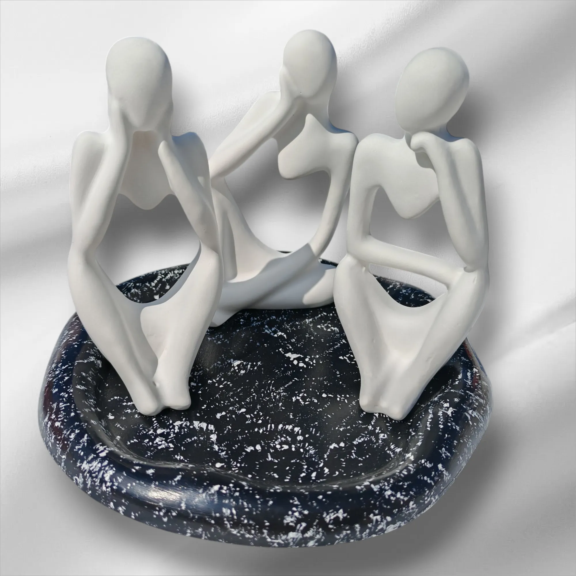 Sadece estetik açıdan değil, aynı zamanda mekânınıza modern bir ruh katan bu obje, sehpa üstlerinde, kitaplık raflarında veya çalışma masasında sergilenebilir. Sanat ve sadeliği bir araya getiren tasarımıyla hem hediye seçeneği olarak hem de kendi yaşam alanınızda şıklık yaratmak için tercih edebilirsiniz.Ürün Özellikleri:Modern ve minimalist tasarımÜç figürlü dekoratif objeMermer desenli siyah tabanDayanıklı reçine/seramik görünümlü malzemeEv, ofis, kafe ve otel dekorasyonu için uygunHediye olarak ideal kullanım Soyut 3'lü Heykel Seti Sunum Tablasıyla. Heykeller BeyazSunum Tablası Siyah Üstü Beyaz Ürünlerimde kesinlikle ALÇI KULLANMIYORUM.