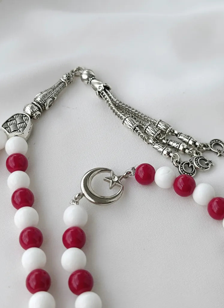 Türkiye Temalı Doğal Taş Tesbih Bileklik Seti - Oniks Mercan, şıklığı ve anlamı bir araya getiren özel bir aksesuardır. Kırmızı ve beyaz renkli doğal taş boncuklar, gümüş renkli metal detaylar ve ay yıldız figürü ile tasarlanmıştır. Hem tesbih hem de bileklik olarak kullanılabilen bu set, tarzınızı yansıtmanın yanı sıra manevi bir anlam da taşır. Bu özel tasarım tesbih bileklik seti, Türkiye sevgisini ve milli değerleri ön planda tutanlar için ideal bir seçimdir. Günlük kullanımda veya özel günlerde kıyafetlerinizi tamamlayacak şık bir aksesuardır. Aynı zamanda sevdiklerinize anlamlı bir hediye alternatifi olabilir. Ürün Özellikleri: Malzeme: Doğal Taş (Oniks, Mercan), Metal Renk: Kırmızı, Beyaz, Gümüş Tema: Türkiye, Ay Yıldız Kullanım: Tesbih, Bileklik Stil: Şık, Anlamlı, Milliyetçi Taş Boyutu: Ortalama 8mm Metal Aksam: Gümüş Renk Kaplama Ek Detaylar: Ay Yıldız Figürlü Uç, Püskül Detayı Kullanım Alanları: Günlük kullanım, Özel günler, Hediye Bakım: Parfüm, krem gibi kimyasallardan uzak tutulması tavsiye edilir.
