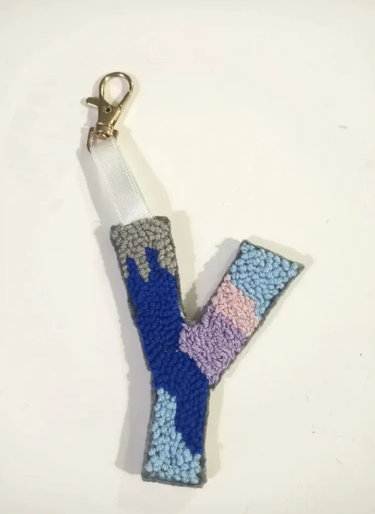 Y Harfi Punch Nakışı Anahtarlık Mavi Lila Pembe Renkli El Yapımı